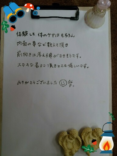 体験して 体のケアはもちろん内面の事など教えて頂き 前向きに考える事ができそうです。
