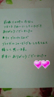 ブライダル関係でこちらのアイグラッチェさんを利用させてもらいましたが、今後も通っていきたいと思いました。