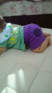 寝返りからハイハイのポーズまでで、前に進むことはできなかったベビーですが、なんと!目の前にミッキーマウスのオモチャを置くと…一生懸命オシリをあげて!…一歩!ハイハイが!できたのです!o(^-^)o